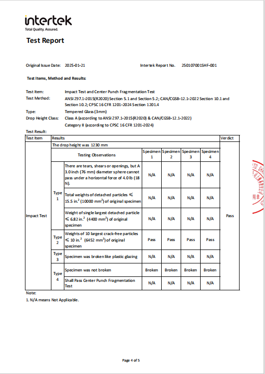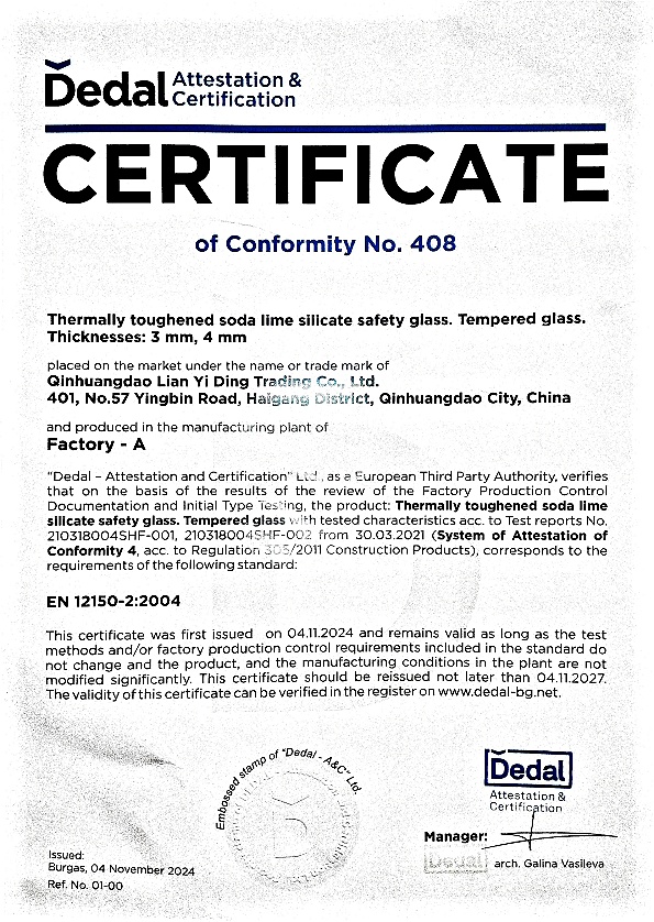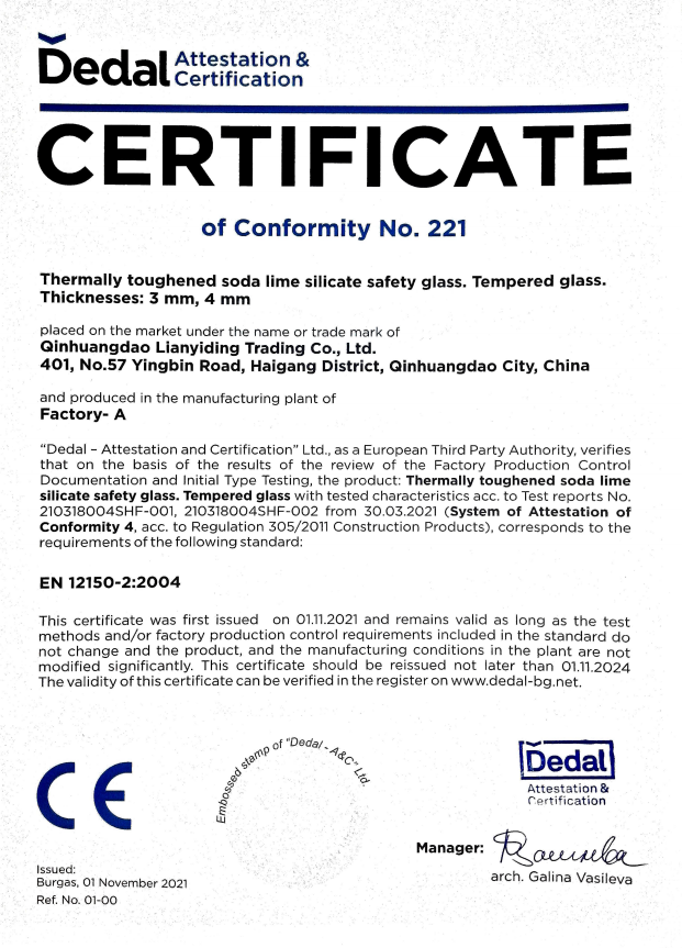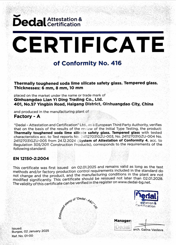Закаленное стекло LYD соответствует стандартам CE EN-12150, CAN CGSB 12.1-2022, ANSI Z97.1-2015(R2020) и CPSC 16 CFR 1201-2024. Полный отчет об испытаниях можно получить у наших торговых представителей.